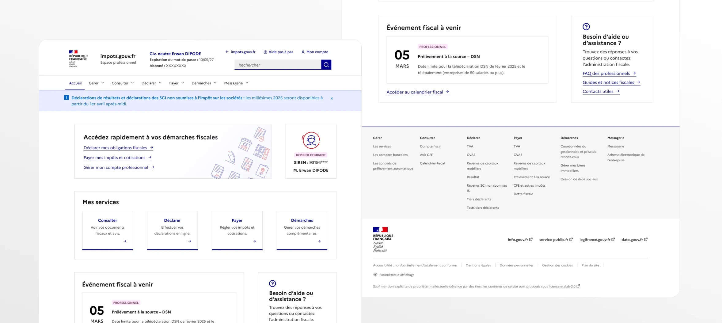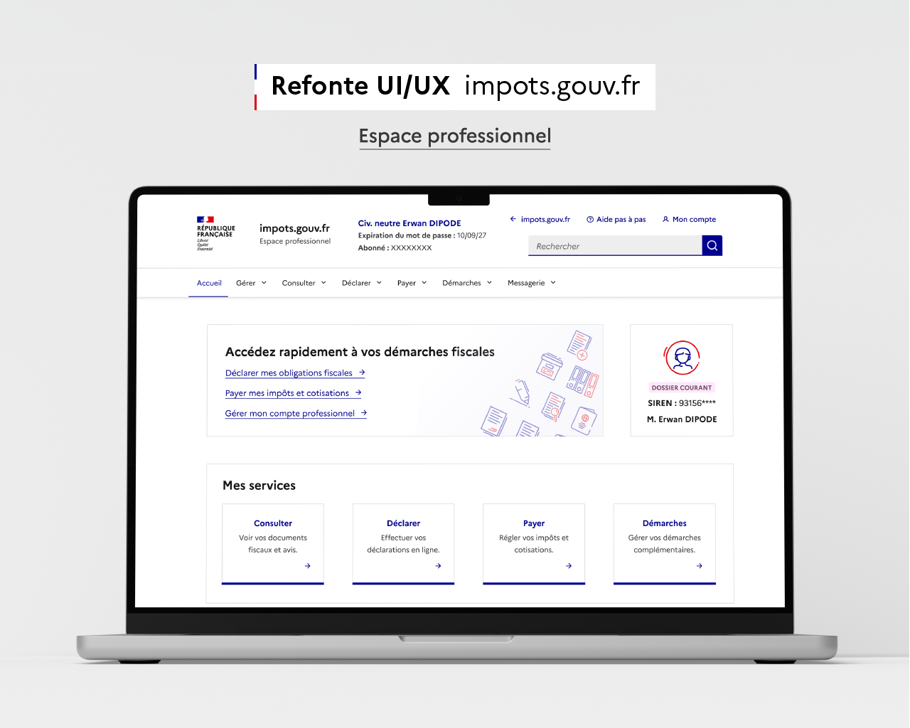 Ce projet est né d’un constat simple. L’interface actuelle peut générer de la confusion et de la frustration, notamment en raison de la densité d’informations et de la multiplicité des parcours. J’ai donc imaginé une refonte de l’espace professionnel, avec l’objectif d’améliorer la lisibilité et la fluidité, tout en respectant les codes et les contraintes propres à un service public.