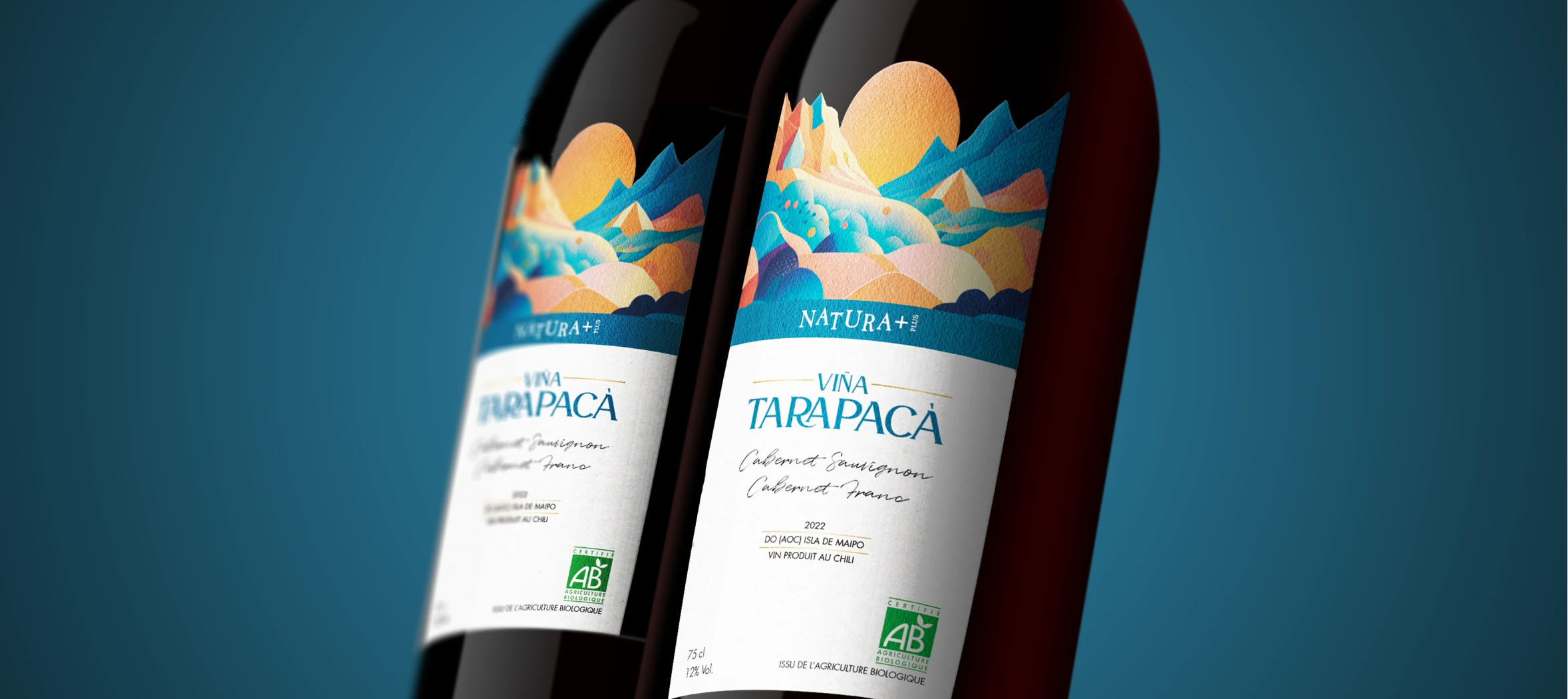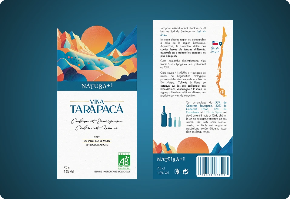 L’illustration devient le cœur du dispositif. Un paysage stylisé, inspiré des reliefs chiliens, évoque la vallée, le soleil, la terre et le climat. Les formes géométriques et les dégradés de couleurs permettent de créer une scène chaleureuse et expressive, tout en conservant une lecture élégante et maîtrisée.