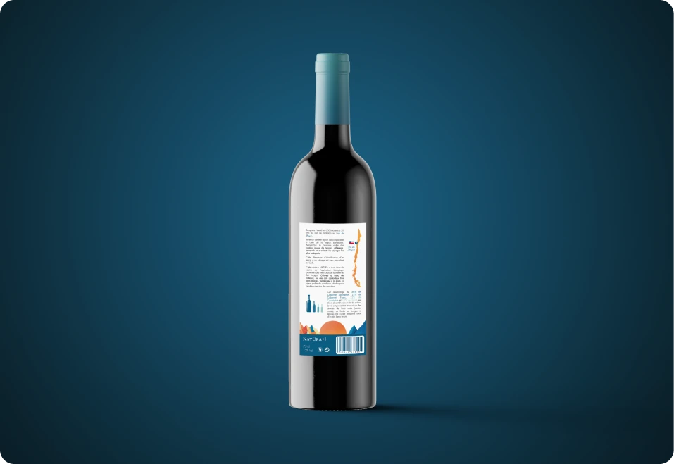 La composition hiérarchise clairement les informations essentielles : nom de la cuvée, appellation, cépages, millésime et certification biologique. La typographie mêle rigueur et finesse afin d’équilibrer le caractère illustratif de l’étiquette avec les exigences du secteur viticole.
