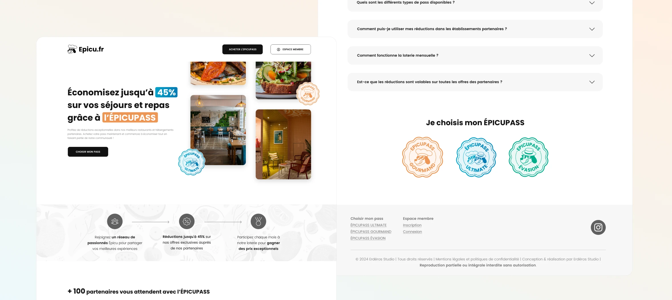 Les différents pass (Gourmand, Évasion et Ultimate) sont clairement différenciés, avec un univers visuel propre à chacun, afin de faciliter la comparaison et le choix. Le pass Ultimate est volontairement mis en avant comme l’offre la plus complète, combinant restauration et hébergements.
