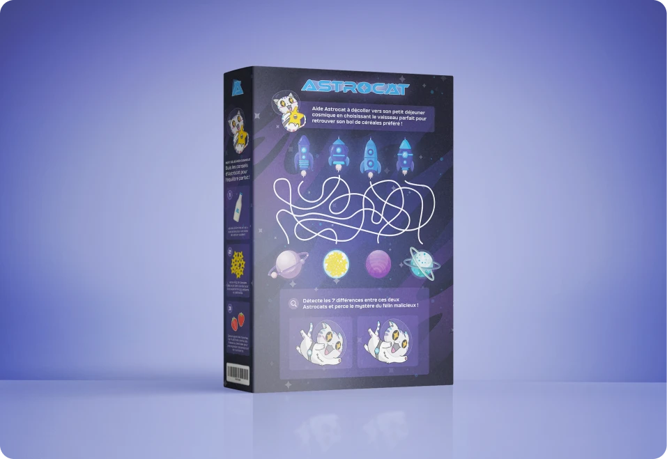 L’univers graphique s’inspire de l’espace et de l’aventure spatiale. Les couleurs vives, les formes dynamiques et les éléments illustrés créent un décor immersif, tout en conservant une lecture claire des informations essentielles. Le packaging a été conçu dans une logique recto verso, avec une face très identitaire et une autre plus interactive, intégrant des jeux et des éléments de narration.