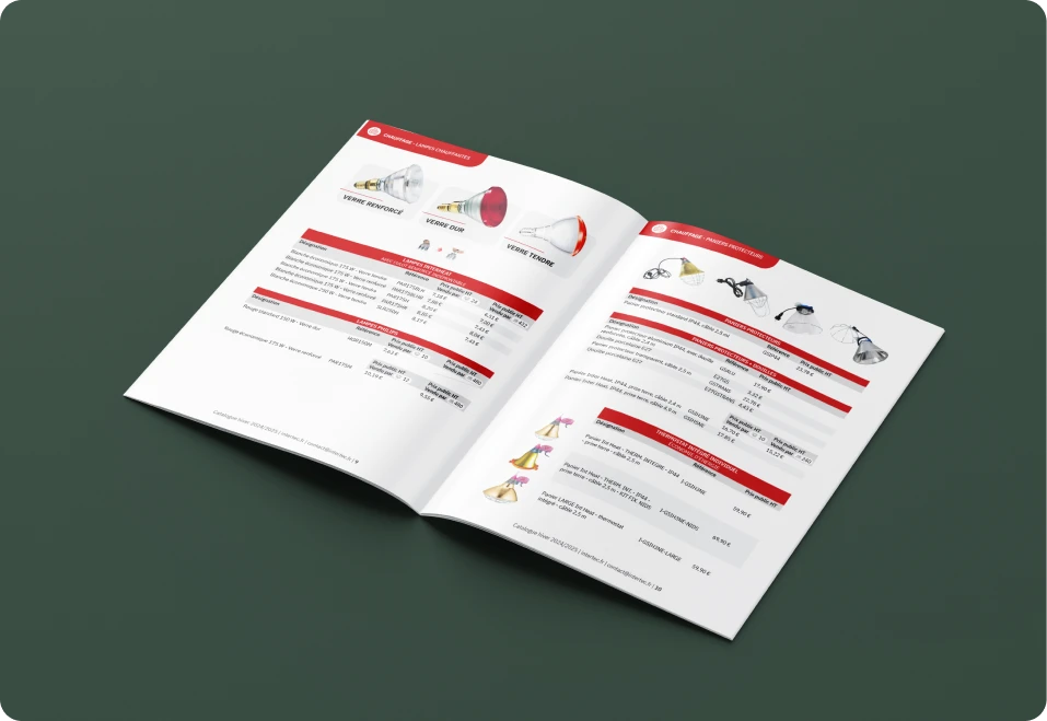 Pour le catalogue hiver 2024–2025, le travail s’est concentré sur la structuration des familles de produits (chauffage, éclairage, sondes), la hiérarchisation des informations et la clarté des fiches. L’objectif était de proposer un document facile à consulter, utilisable aussi bien comme support papier que comme catalogue interactif, avec des renvois directs vers les fiches produits en ligne .