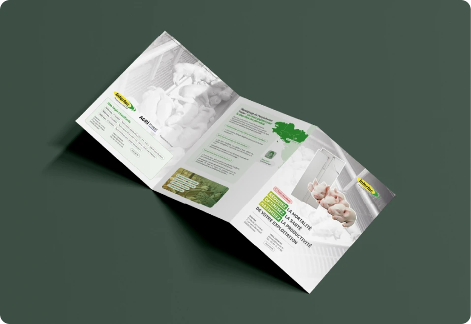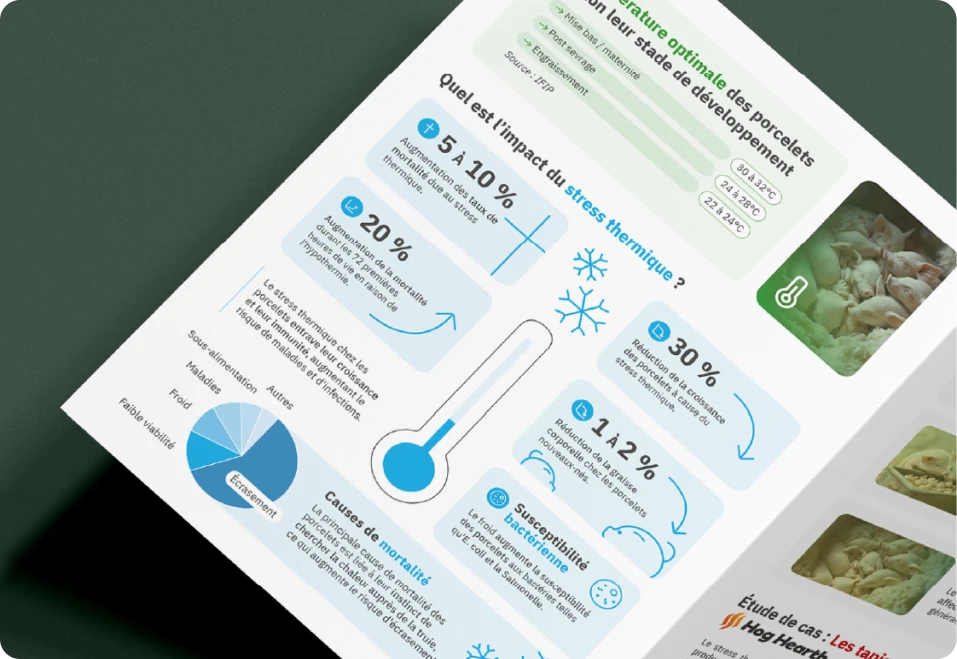 Le dépliant 3 volets consacré aux tapis chauffants adopte une approche différente. Il met en avant les bénéfices concrets pour les exploitations, en s’appuyant sur des données chiffrées, des comparatifs et un témoignage terrain. Le support a été pensé comme un outil d’aide à la décision, capable d’expliquer clairement les enjeux de bien-être animal, de consommation énergétique et de rentabilité .
