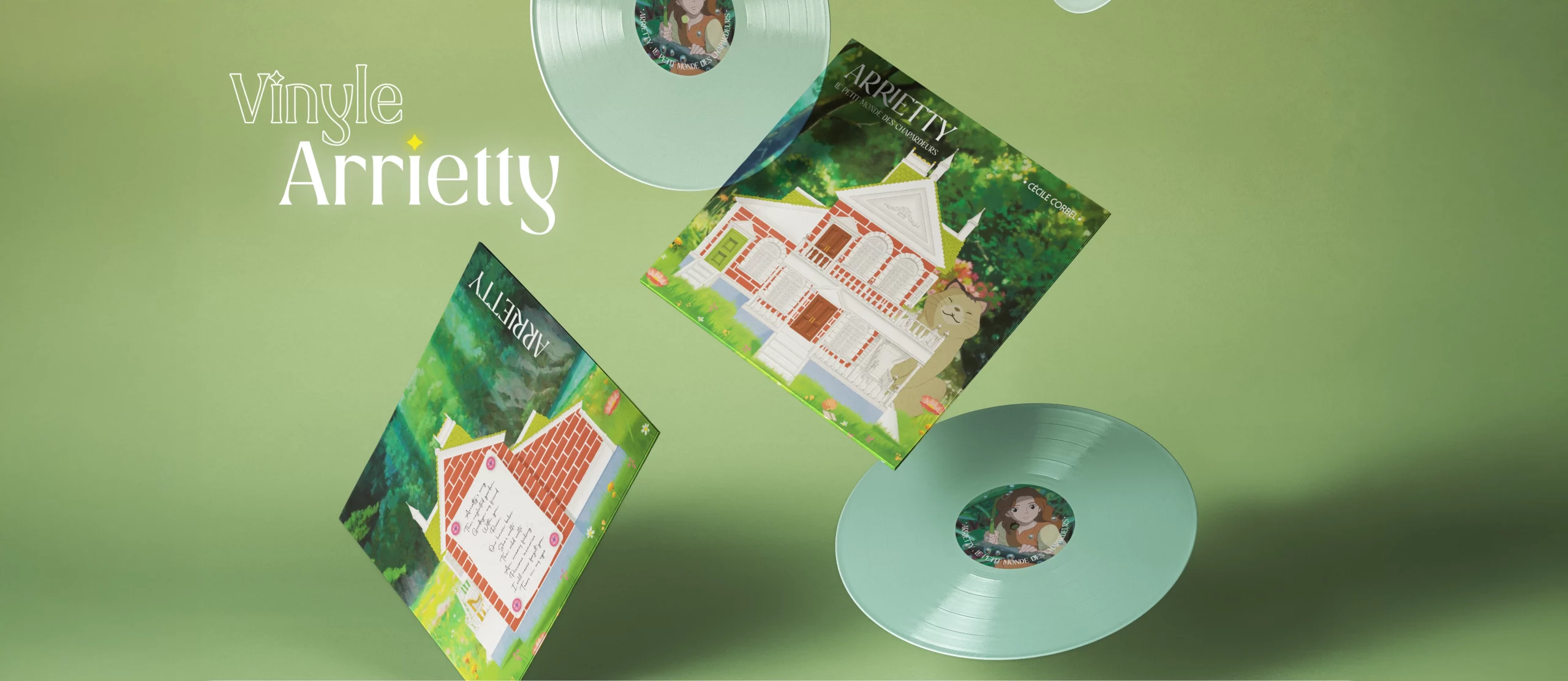 Le format gatefold permet de déployer cet univers. Il intègre des éléments interactifs en pop-up, conçus comme des fenêtres vers le monde miniature d’Arrietty. Le choix du vinyle transparent, associé à une pochette intérieure illustrée, renforce cette sensation de fragilité et de poésie.